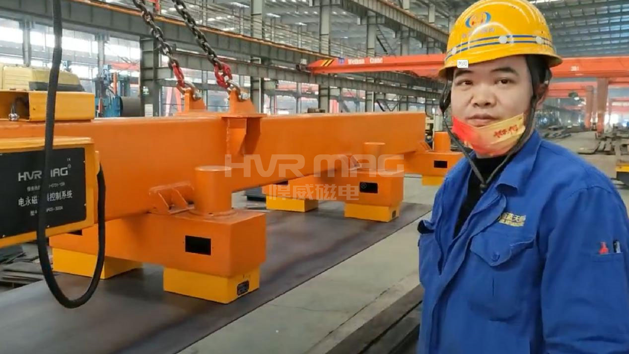 這是該鋼結構廠的一名操作員,他每天負責的主要工作之一,便是指揮悍威磁電的磁力吊具進行上下料,當問道最近入手的悍威磁電磁力吊具感受如何時,他笑著說:“用起來很方便,斷電后磁性也沒有消失,吸附的很緊密,相比于鋼絲繩要方便很多,而且我們還有臺大的悍威磁電磁力吊具,已經用了好幾年了,目前還在正常使用”。