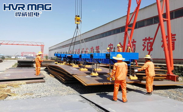 其次,根據(jù)鋼板的尺寸規(guī)格選擇具體的吊具。如果車間需要吊裝鋼板的規(guī)格范圍變化較大,則可選用悍威磁電伸縮梁電永磁吸盤吊具,或利用多臺(tái)鋼板專用電永磁吸盤吊具吊裝的方案搬運(yùn)鋼板。