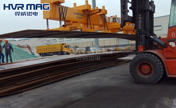 露天碼頭,物流等外部空間需要轉運鋼板時,很多企業要求高效率,安全性,悍威磁電一直在做的一款叉車充電式電永磁吊具就能很好的滿足客戶要求。他有哪些優點呢。