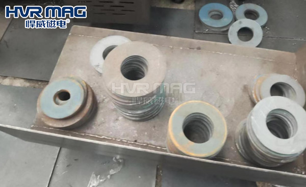 首先客戶的工件外徑有150-250mm不同大小,但是內徑基本固定在3種大小,厚度也是固定的,由于客戶需要全部采用一套電永磁進行搬運,需要考慮全部的兼容性。我們就根據內徑的相差不大的特點,選擇使用圓形磁鐵布置在內徑周邊位置,考慮到需要進行翻轉動作,采用了直徑40mm,吸力20KG的4個圓形磁鐵搬運。內徑這個地方所有的工件基本都有相交叉的吸附面積,這樣就完成了所有工件的兼容性。