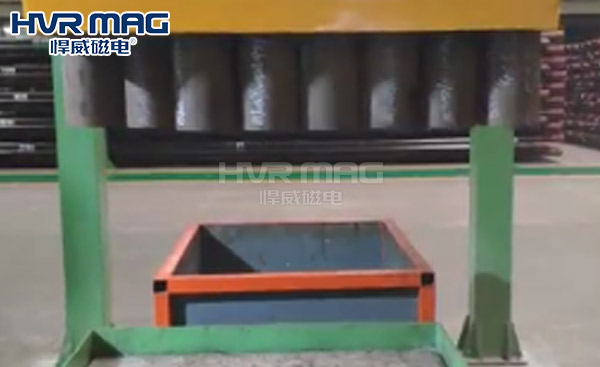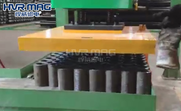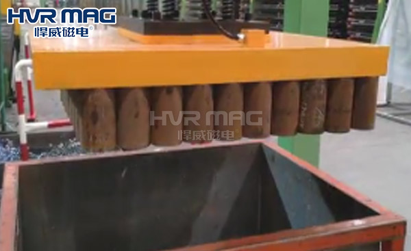 該自動化實例可以看到,電永磁可以通過一臺整體的電永磁鐵進行吸附60-70個產品,確保產品安全的搬運不掉落和可通過控制器來調節磁力大小,加上彈簧進行柔性搬運。