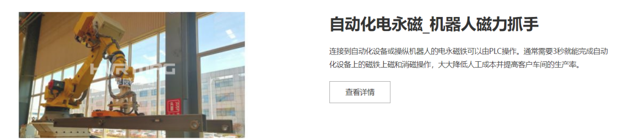 悍威磁電作為擁有著10多年電永磁經驗的高新技術企業,也是中國最早一批研究電永磁的企業,服務了數千家機械制造商,為車間高效吊裝鋼板、鋼管、型材及異形件提供了合適的解決方案,三一重工、中聯中科、中國石油、美的、比亞迪等國內外大企業均是我們的客戶,我們擁有著豐富的電永磁系列產品案例,產品廣銷歐美、日本、韓國等40多個國家和地區,是您身邊可靠的電永磁吸盤廠家,如果您對電永磁系列產品感興趣,歡迎聯系我們。