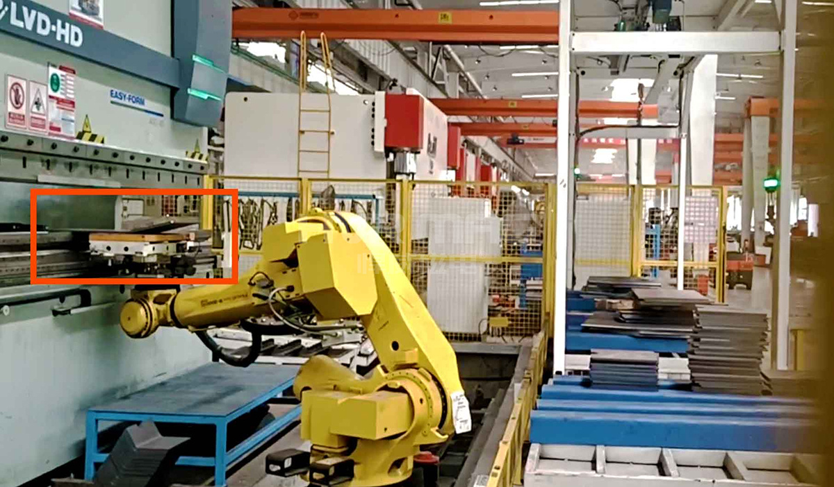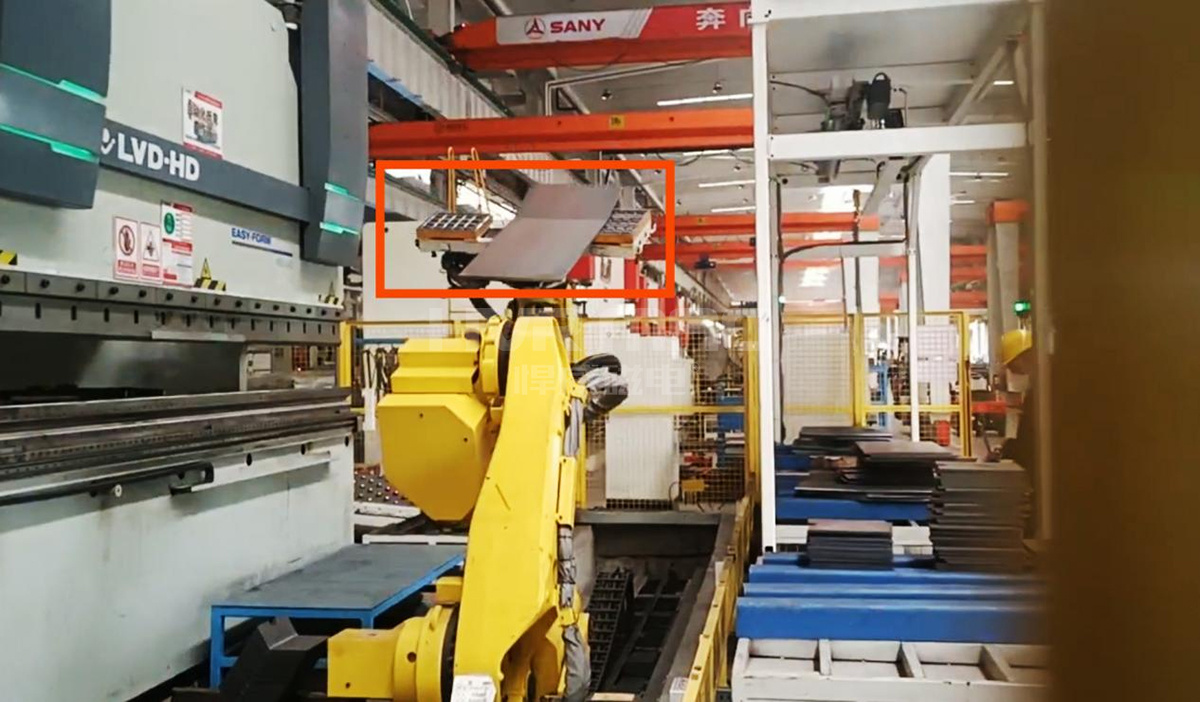 在自動化折彎的過程中,越來越多的制造商開始選擇電永磁鐵配合機器人進行搬運、夾持。如今,這一現象日漸普遍。如下圖所示,在三一重工生產車間,可以見到悍威磁電所生產的電永磁鐵,在配合機械手搬運工件,并將工件放置在折彎機上折彎。從某種程度上來說,電永磁鐵助力工件自動化折彎。