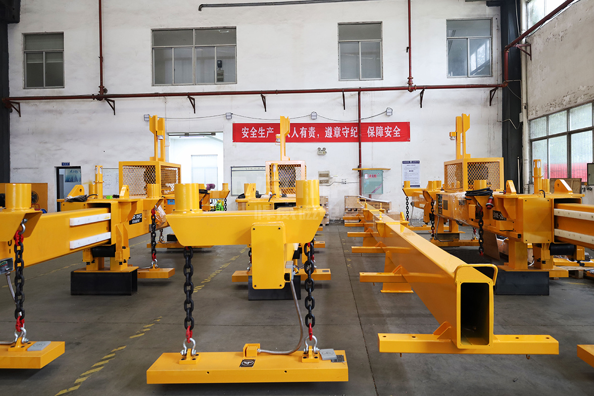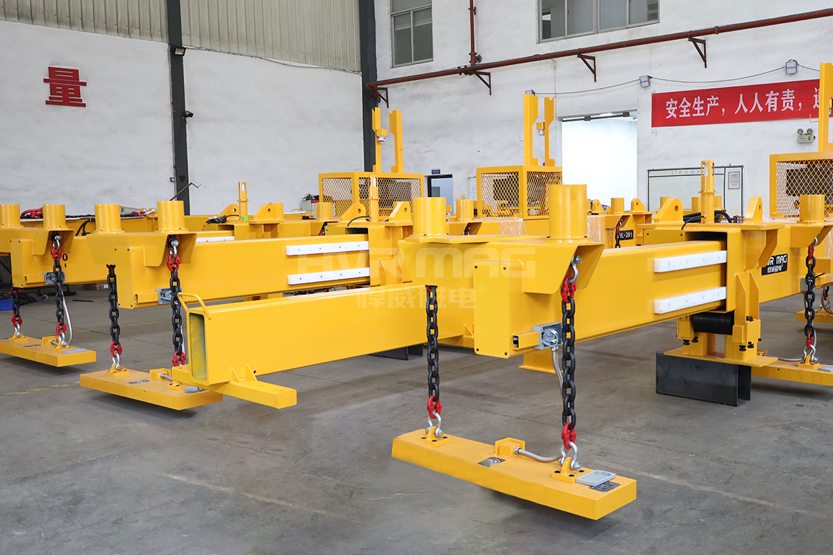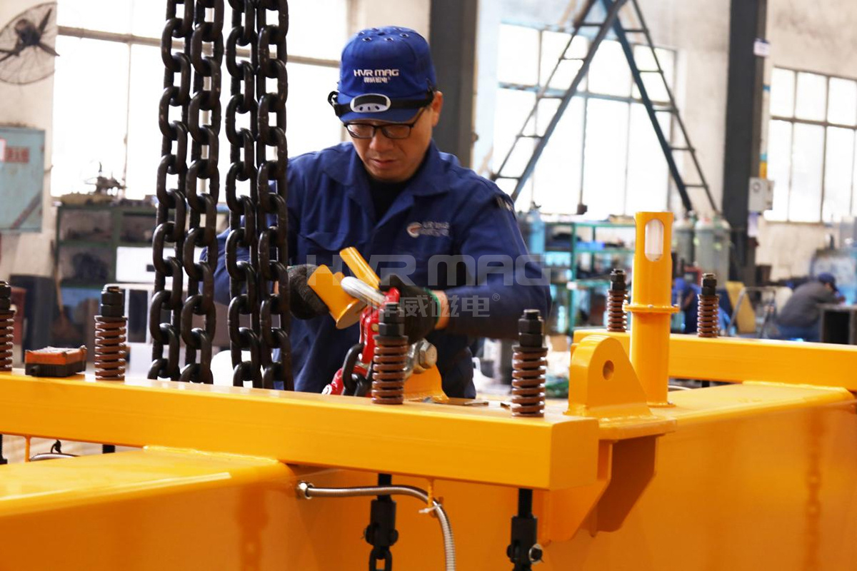 一臺臺黃橙色的電永磁吊具整齊地碼放在悍威磁電廠房車間,這是悍威人辛勤勞動的成果,也是客戶對悍威磁電給予的強烈認可。悍威磁電機械質檢員、電器質檢員、技術工程師們等工作人員對已經制作完成的電永磁吊具進行著全方面認真細致地檢測,確保國內外客戶收到品質優良的貨物。