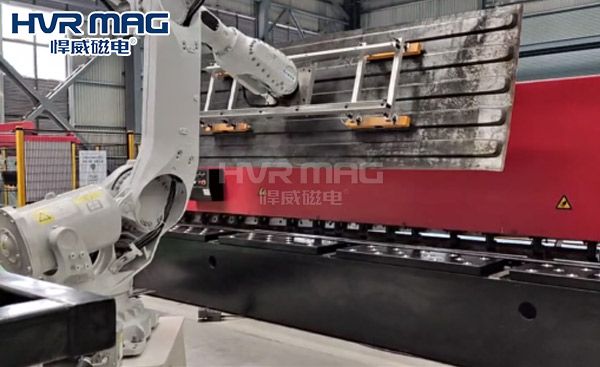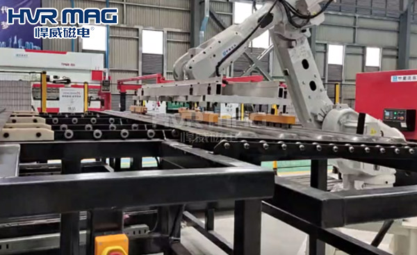 電永磁鐵作為工業生產中吸附工件的一大利器,除了可以作為電永磁起重器搬運鋼板、鋼管等工件之外,還可以將其安裝在工業機械手末端用來實現自動化搬運。今天電永磁吸盤廠家悍威磁電帶您走進車間,看下悍威機械手磁力吸盤吸附工件進行翻轉的車間實景案例。