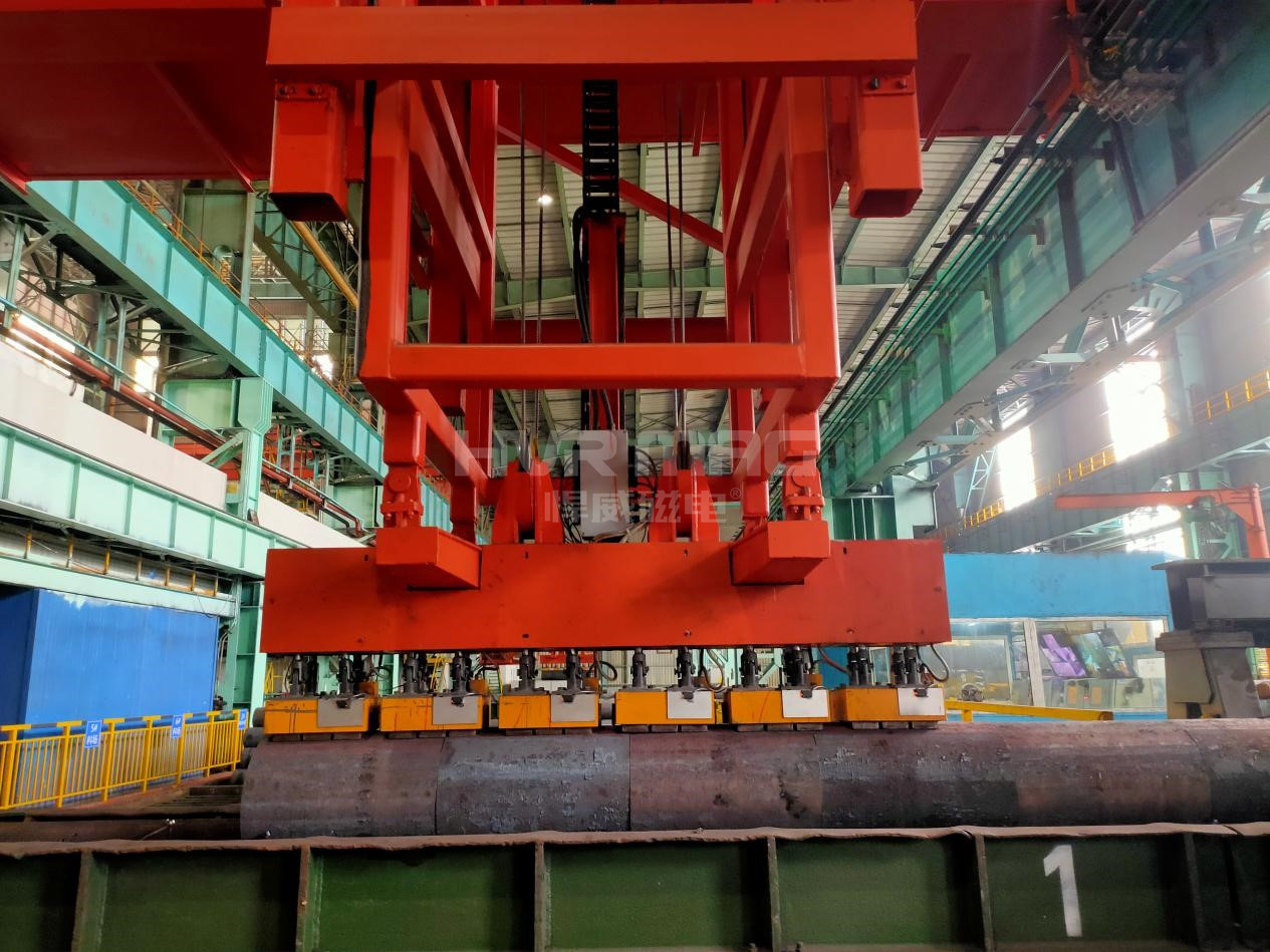 下圖所示的智能起重機,配備了悍威磁電定制研發生產的6臺型號為HEPMSP-600P70S的電永磁鐵,通過配套的HEPC5-900A-T01電永磁控制器,實現單獨控制每臺磁鐵(PLC端輸出控制)。