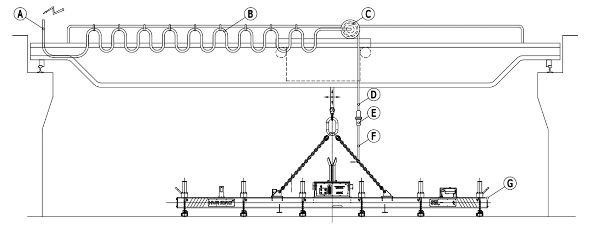 A:輸入電源 B:行車滑線 C:電纜卷筒 D:卷筒升降電纜 E:重載連接器 F:電永磁控制系統電源進線 G:橫梁