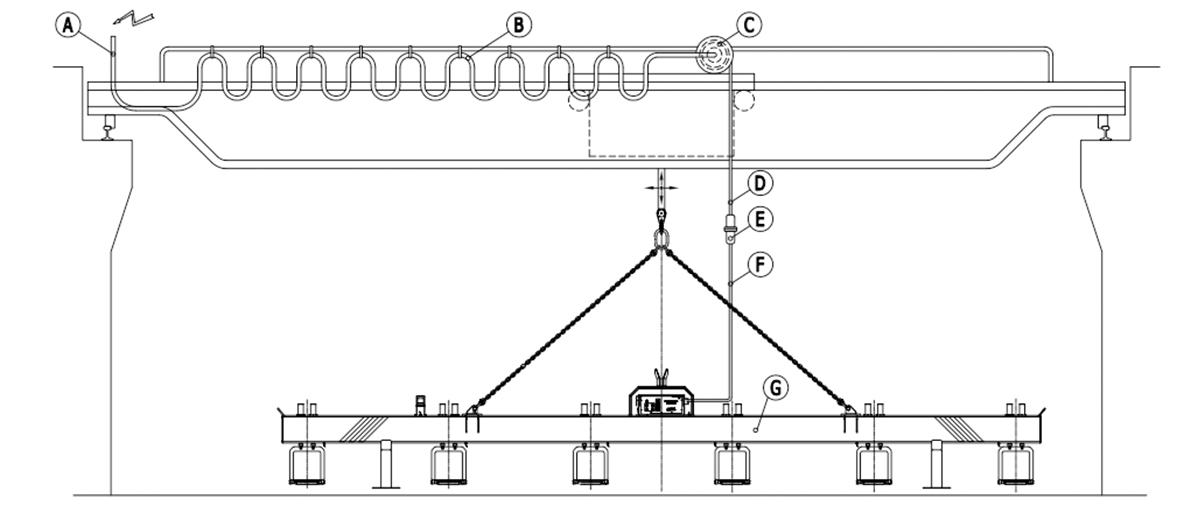 A:輸入電源 B:行車滑線 C:電纜卷筒 D:卷筒升降電纜 E:重載連接器 F:電永磁控制系統(tǒng)電源進線 G:橫梁
