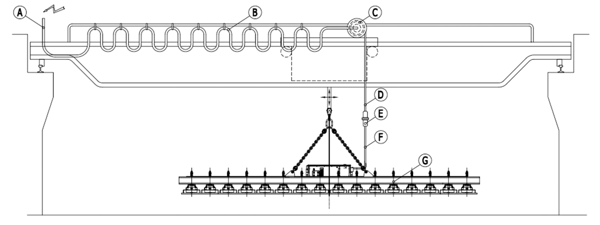 A:輸入電源 B:行車滑線 C:電纜卷筒 D:卷筒升降電纜 E:重載連接器 F:電永磁控制系統電源進線 G:橫梁