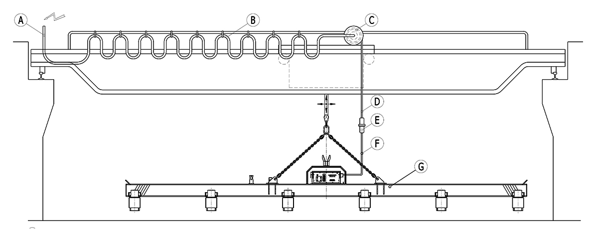 A:輸入電源 B:行車滑線 C:電纜卷筒 D:卷筒升降電纜 E:重載連接器 F:電永磁控制系統電源進線 G:橫梁
