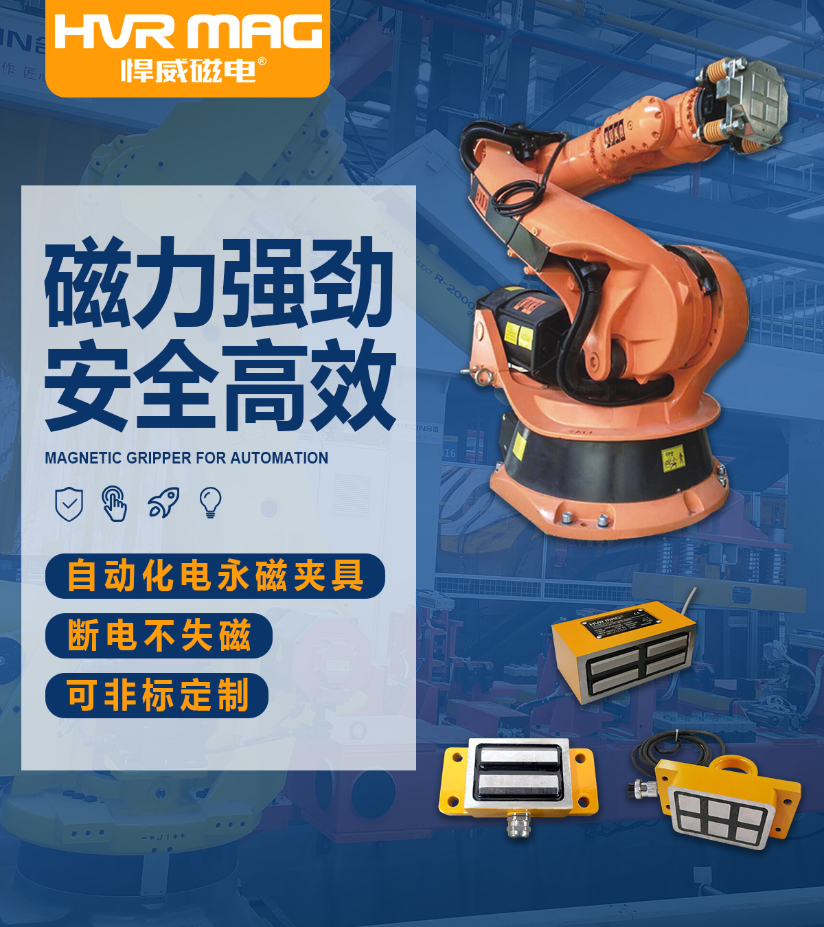 連接到自動化設備或操縱機器人的電永磁鐵可以由PLC操作。通常僅需要3秒就能使自動化設備上的磁鐵完成上磁和消磁操作,大大降低人工成本并提高客戶車間的生產率。