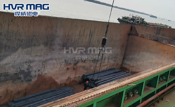 1,單純的電永磁方案可以給到客戶,以2塊大型電永磁鐵進行吊裝,要求在吊裝時滿足磁鐵能與產品進行接觸。需要用戶及終端在裝運時對鋼管進行有規律的“碼垛”,方便我電永磁吊具吊裝。