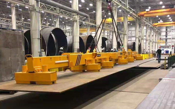 鋼結構加工車間,如何將重達10噸以上不同尺寸的鋼板搬運至切割線臺面上?磁力伸縮梁鋼板吊具是您不二選擇。