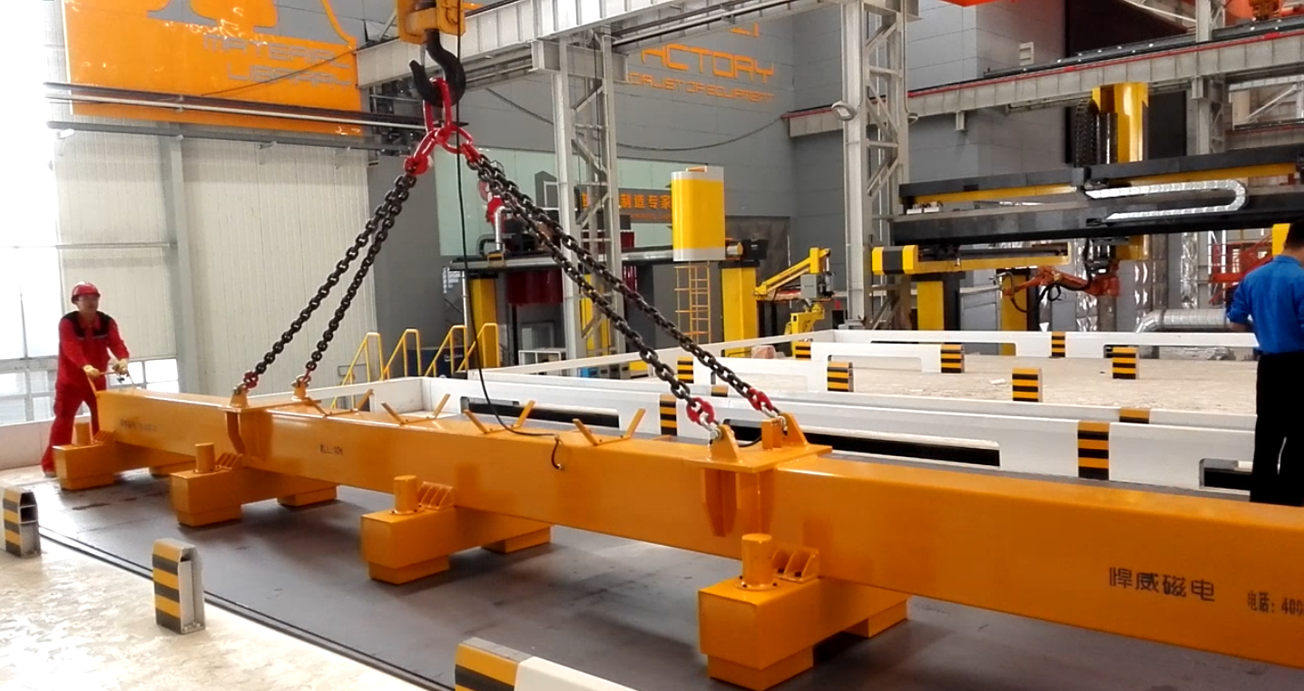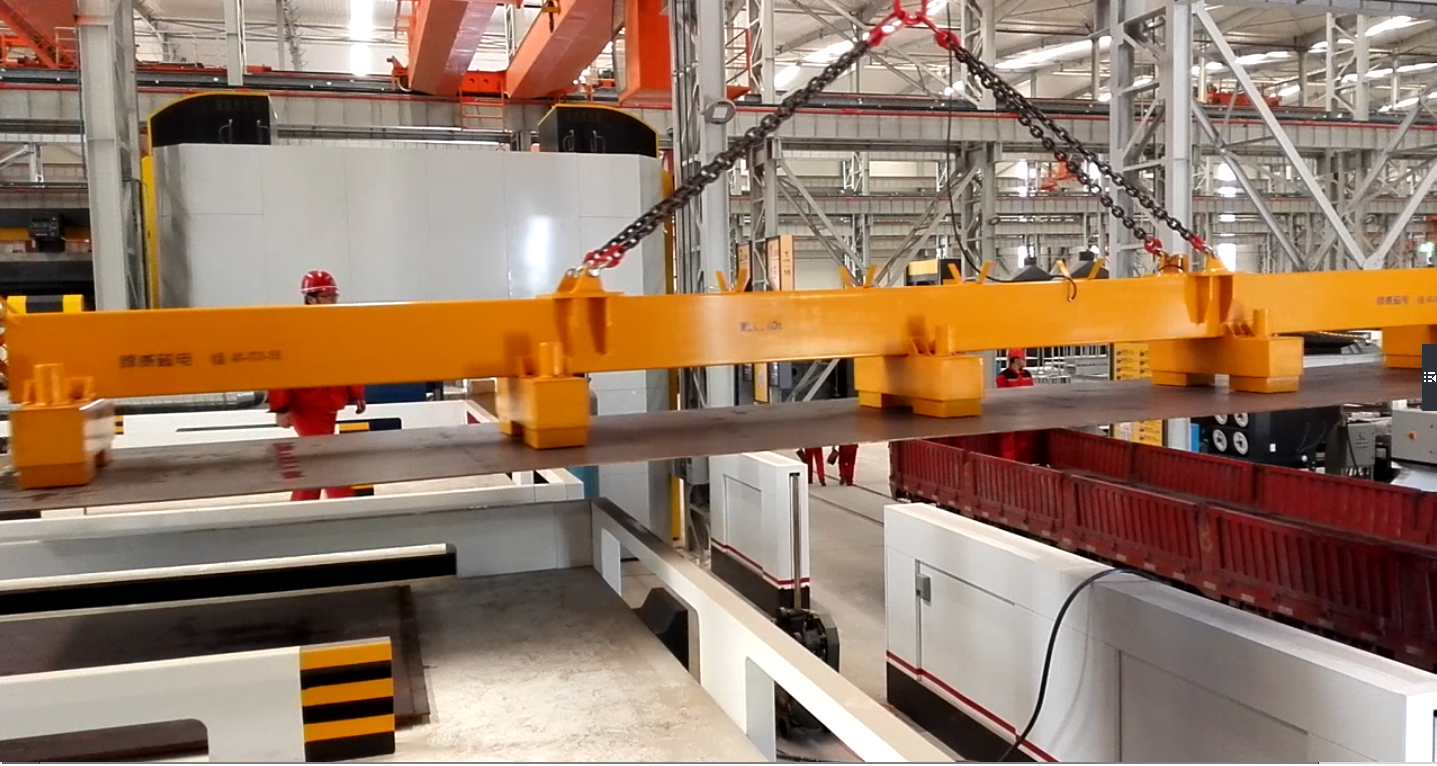 解決方案:設(shè)計(jì)用10臺(tái)HEPMP-1000P50按2行5列布置聯(lián)合吊運(yùn),吊具磁鐵可分組控制,適應(yīng)不同長(zhǎng)度鋼板吊運(yùn),磁力可調(diào),滿足了客戶不同板厚鋼板一次吊運(yùn)一張,不粘連第二張的要求,且無(wú)需人工分板,全程無(wú)線遙控器操作,只需一名工人且勞動(dòng)強(qiáng)度低,充退磁時(shí)間<2S,不但降低了工人數(shù)量和勞動(dòng)強(qiáng)度還提升了吊運(yùn)效率,且鋼板表面無(wú)劃痕產(chǎn)生,吊運(yùn)時(shí)不要電,吸力永久保持,具有極高的安全性。