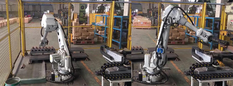 改善后:前后各用一臺工業機器人攜電永磁鐵自動化工作,實現無人操作,效率比原先提高50%,基本沒有維護成本。