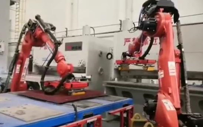如圖所示,液壓閘式剪板機主要用于將板材或板材切成較小的部分,以準備進行其他加工。電磁機器人夾具負責將要切割的金屬零件裝載到剪切機中,然后卸載已切割的零件并將其傳送到碼垛線。