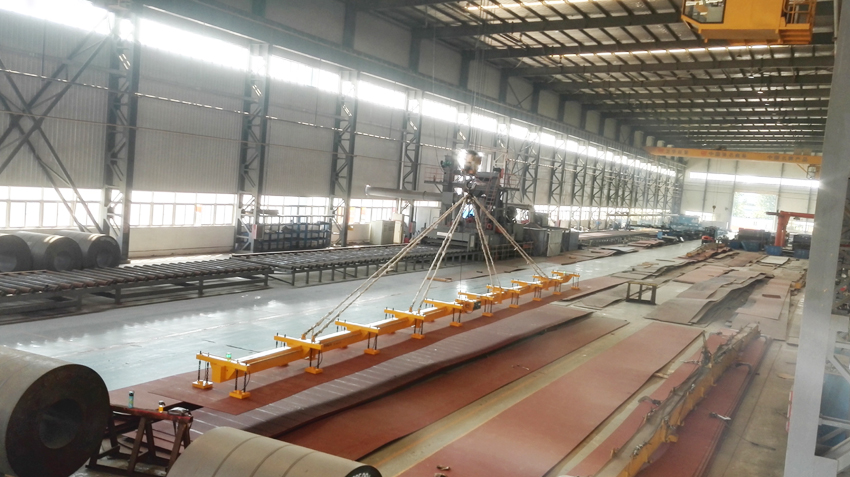 吊運方案:鋼板規格為12-22.5mX1.25-2.0mX6-10mm,用20臺HEPMP-400電永磁鐵聯吊22.5m鋼板方案取代原8個鋼板鉗吊具搬運方案