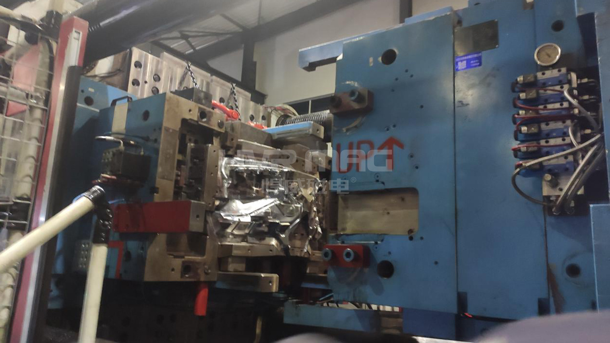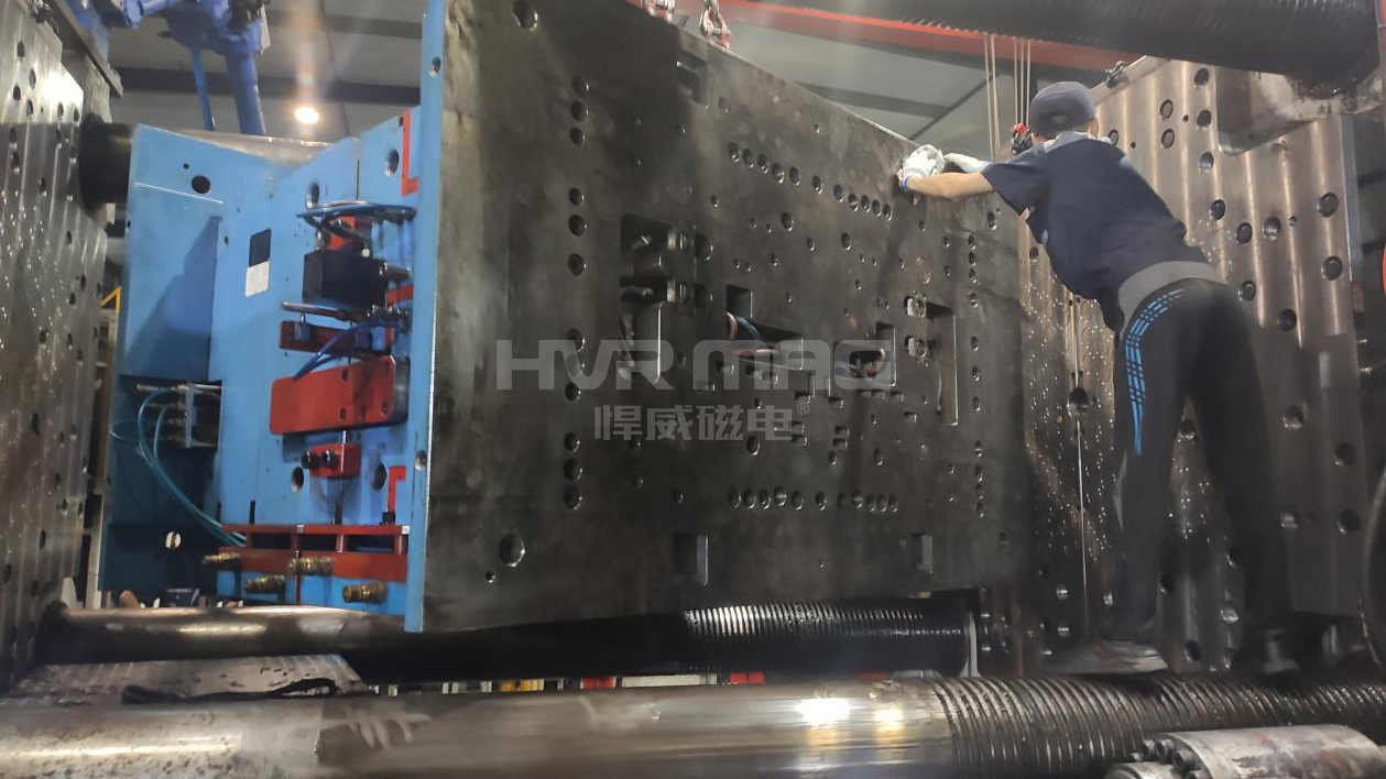 想知道大型注塑機是如何更換模具的么?是的,你沒看錯,下圖是國內(nèi)某注塑成型汽車配件廠家,安裝了磁力模板的2300噸注塑機快速換模現(xiàn)場。